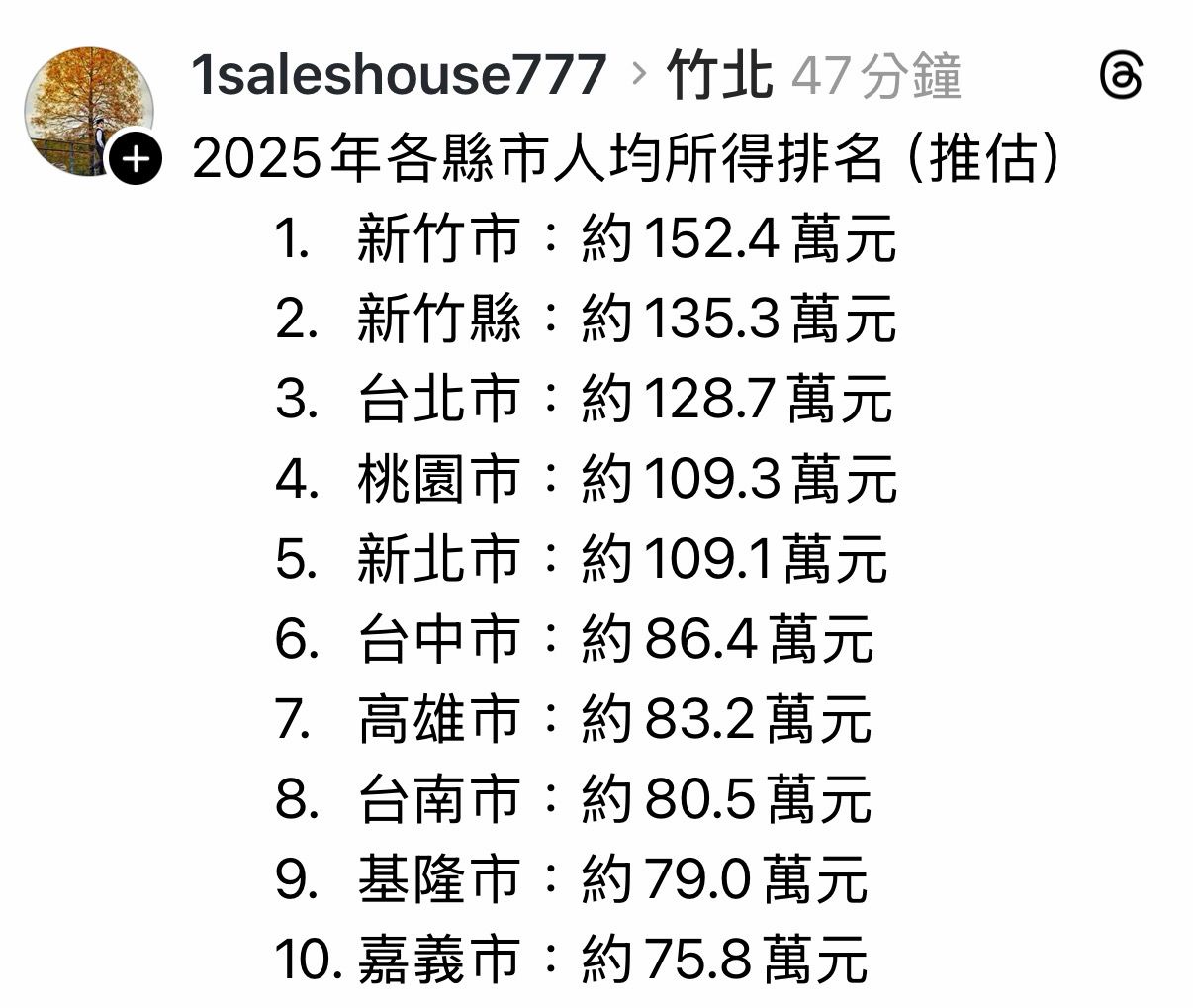 結果居然在六都裡面薪資排行最後