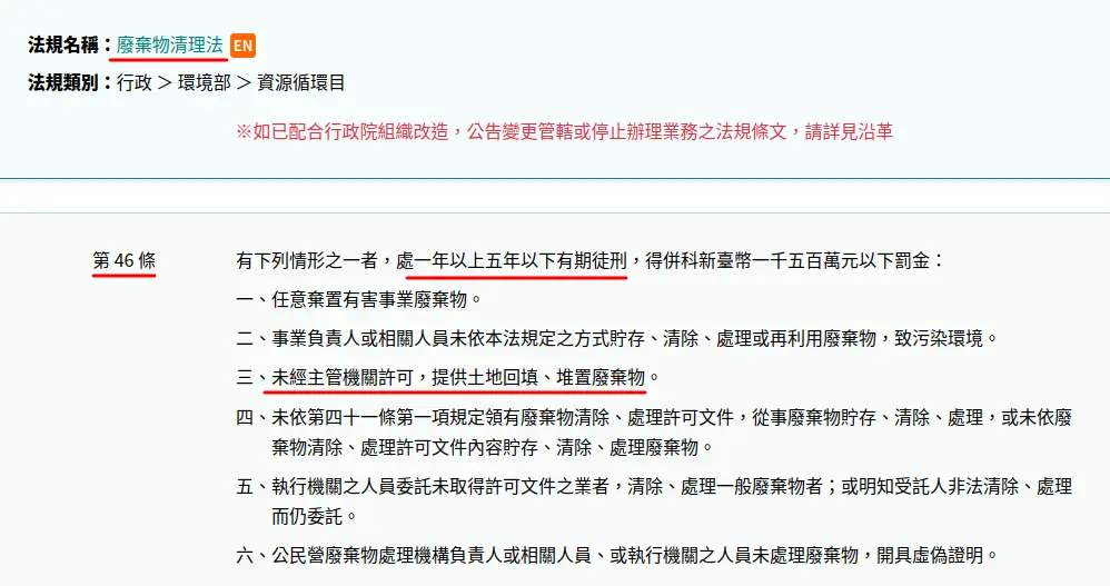 膠等廢棄物,犯行明確,已依廢清法裁處行為人各300萬元罰鍰,並要求清除復原。