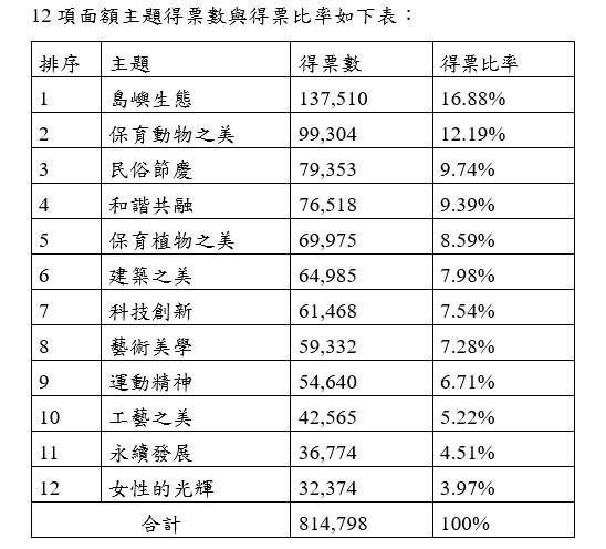 根據最終統計結果,榜首「島嶼生態」獲13萬7510票,佔比16.88%;「保育動物之美」獲9