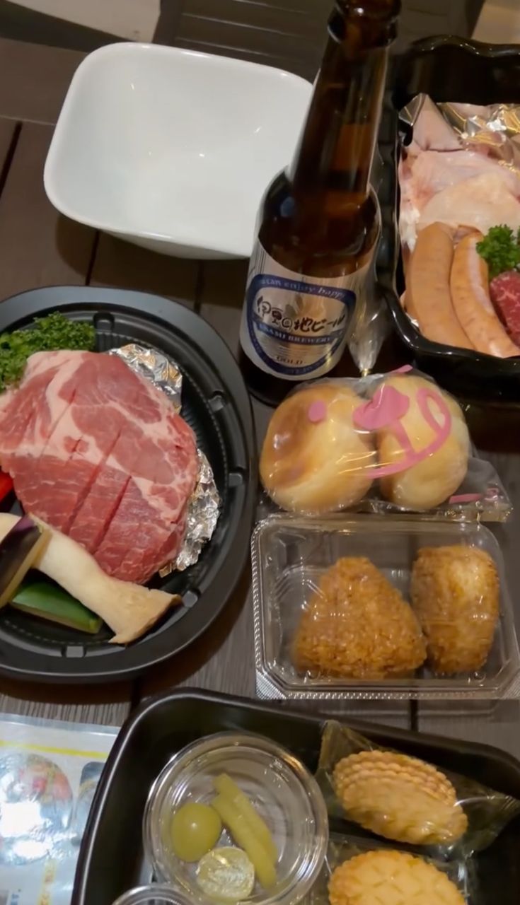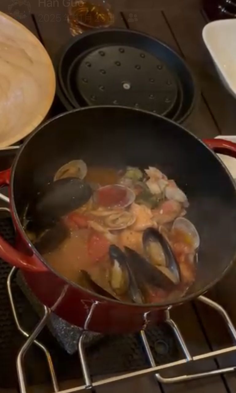烤飯糰、烤小麵包、一整鍋貝類湯、甜點、水果、酒類。
