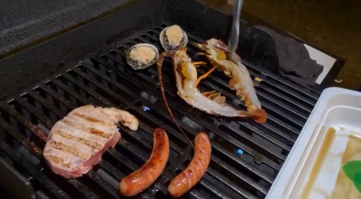 晚餐食材兩人份的龍蝦、厚2.5cm 肋眼牛排、鮑魚、豬排、透抽一隻、德式香腸、蔬菜、