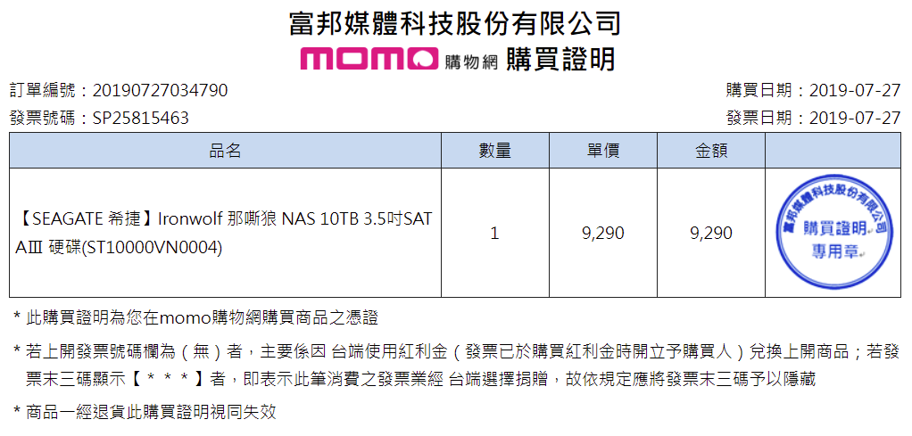 2. 2019/07/27 (momo購) 3年保 *1