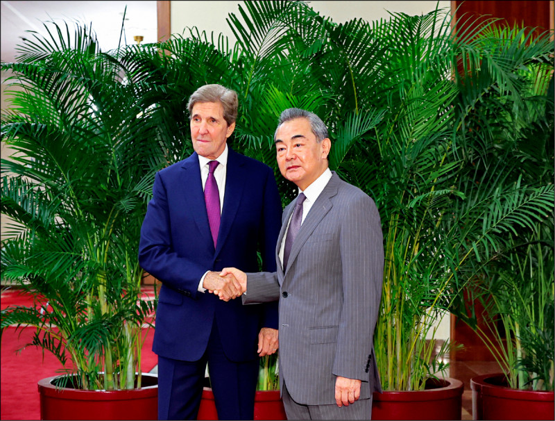 美國氣候特使凱瑞(左)十八日會見中共中央外事辦主任王毅(右)。(歐新社)