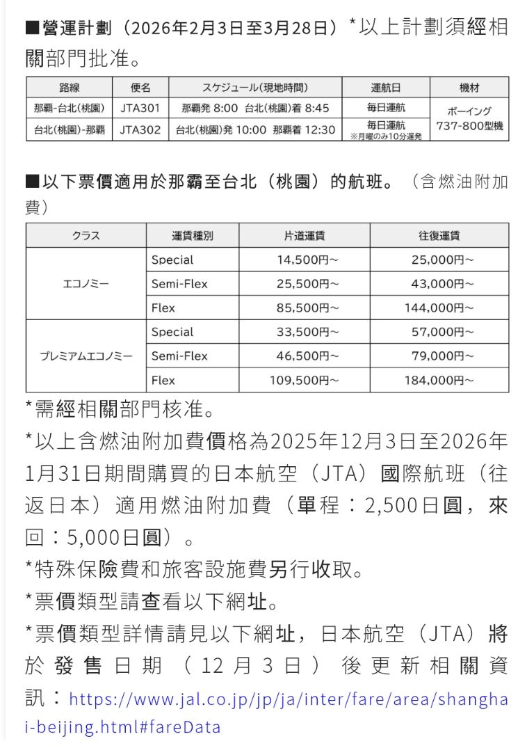 航線台北(桃園)=沖繩(那霸),機票銷售將於台灣時間2025年12月3日上午9時開始,為紀念開