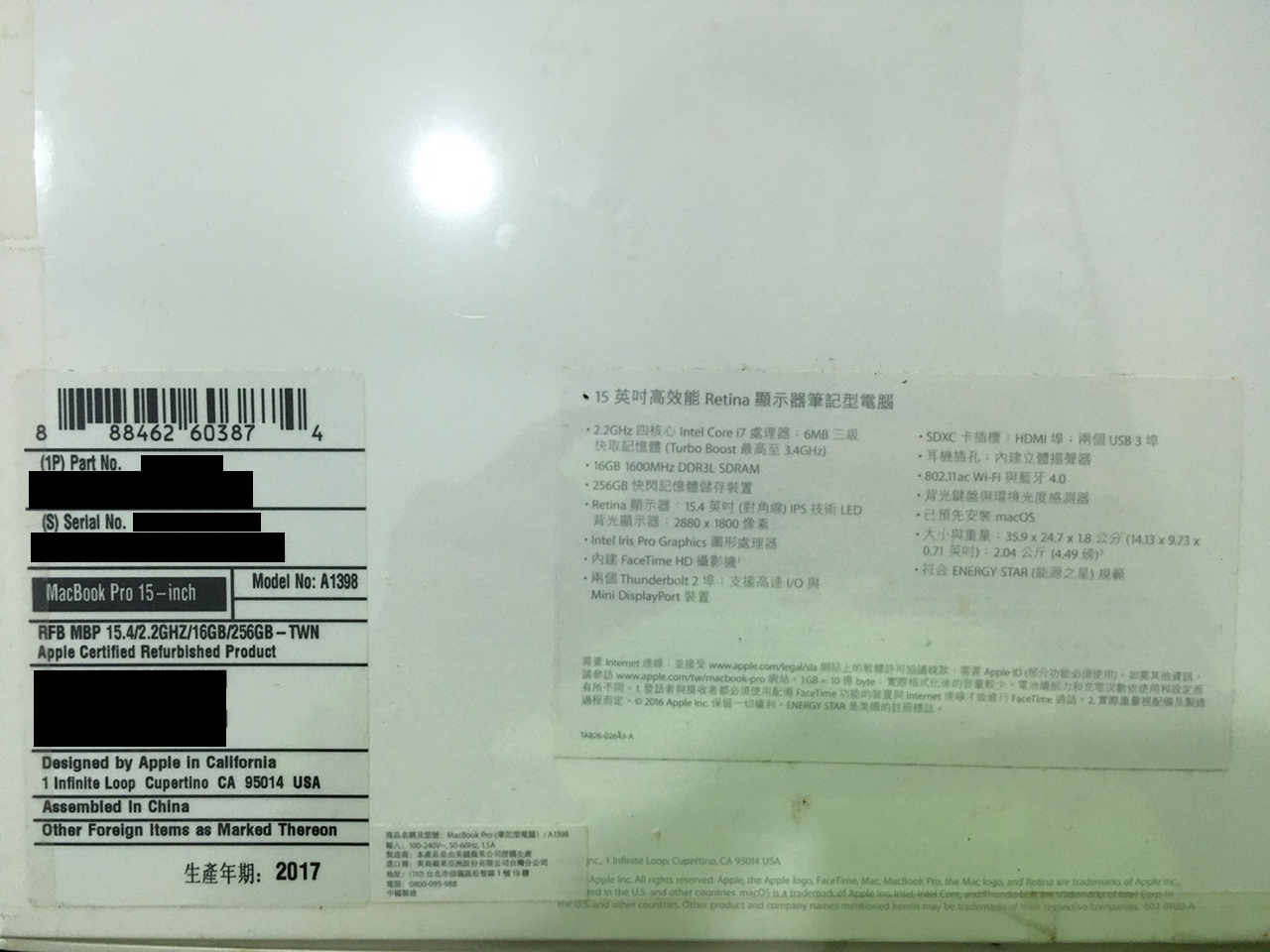 此電腦是於 2017年4月中 Apple Store所購入的整新機