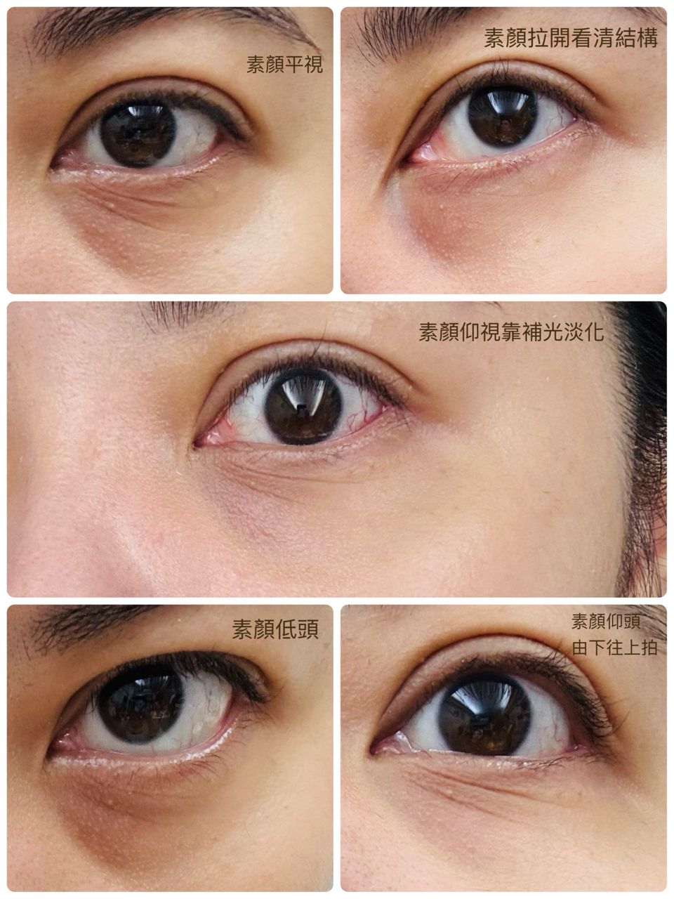 認真研究會發現有紫有褐色,周圍還有青筋,還附加淚溝,完全是對遮瑕產品的大考驗
