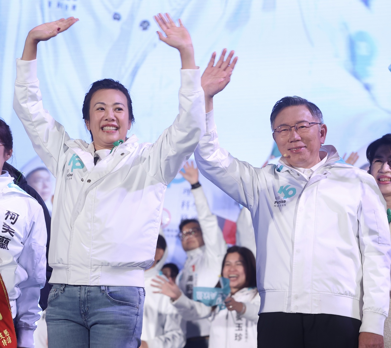 民眾黨昨晚在凱道舉行選前之夜,為正副總統候選人柯文哲(右)、吳欣盈(左)做最後