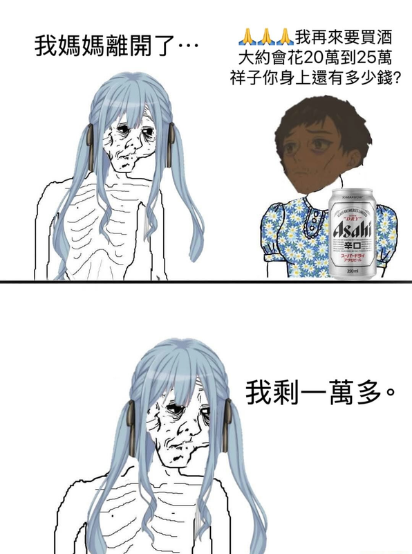小祥 : 媽媽離開了 清告 : 我這次喝酒要20-25萬 ,你剩多少 小祥 : 我剩一萬多 --