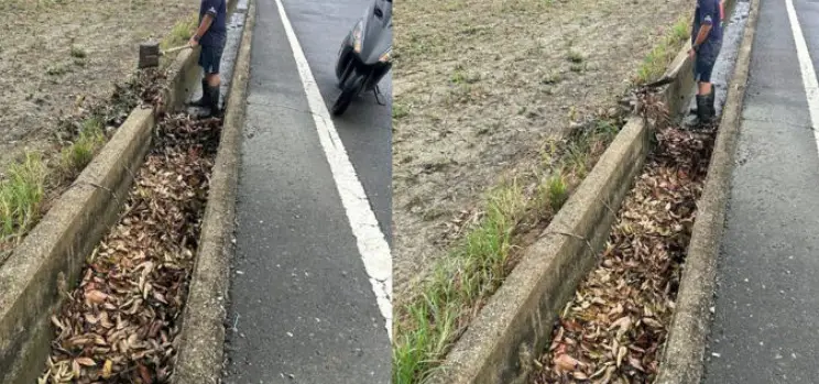 挾帶的落葉、斷枝而阻塞。一名民眾15日清晨在返回西港區八份的途中,意外看見一名少