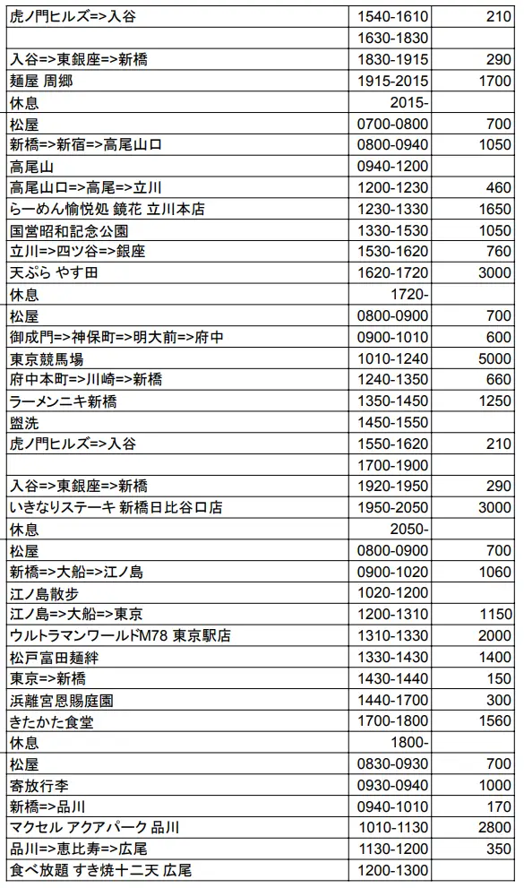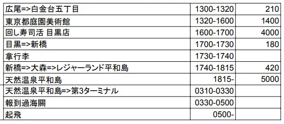 肥肥這次日旅的行程表,