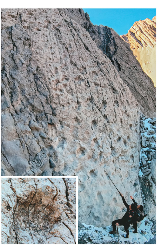。恐龍足跡估計多達兩萬個,有些寬約四十公分,並可見爪痕(如圖),範圍約五公里。