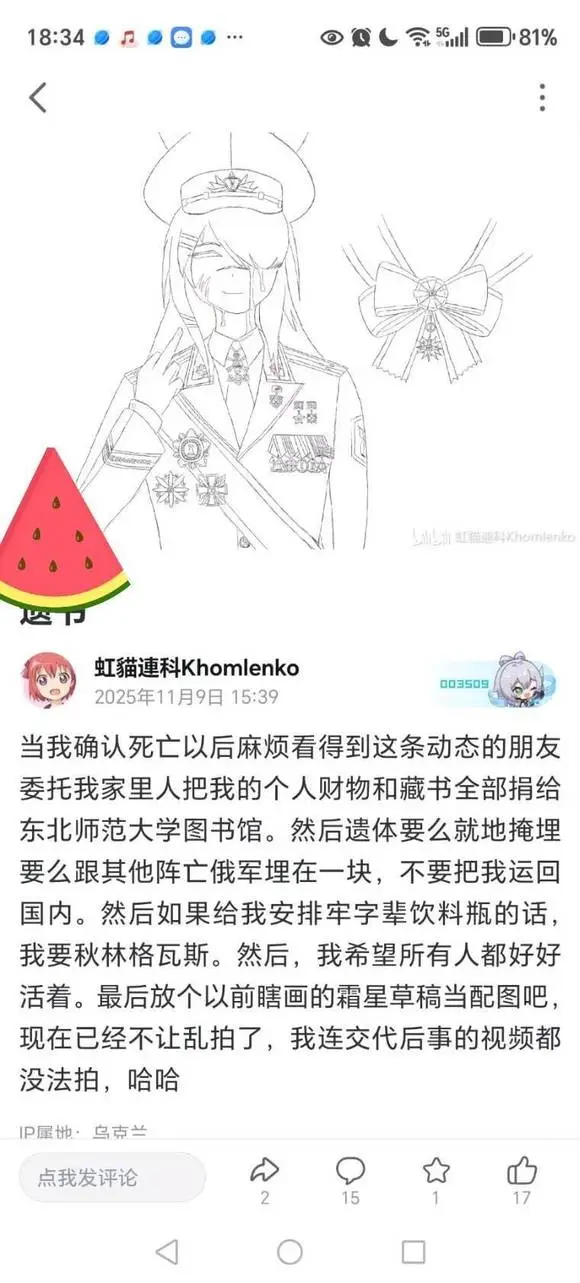 然後他最後一次發文時IP位置已經在烏克蘭了,他疑似參與了紅軍村的戰鬥,然後聊天室群友稱他的陣地被烏方砲擊他大概已經死了。