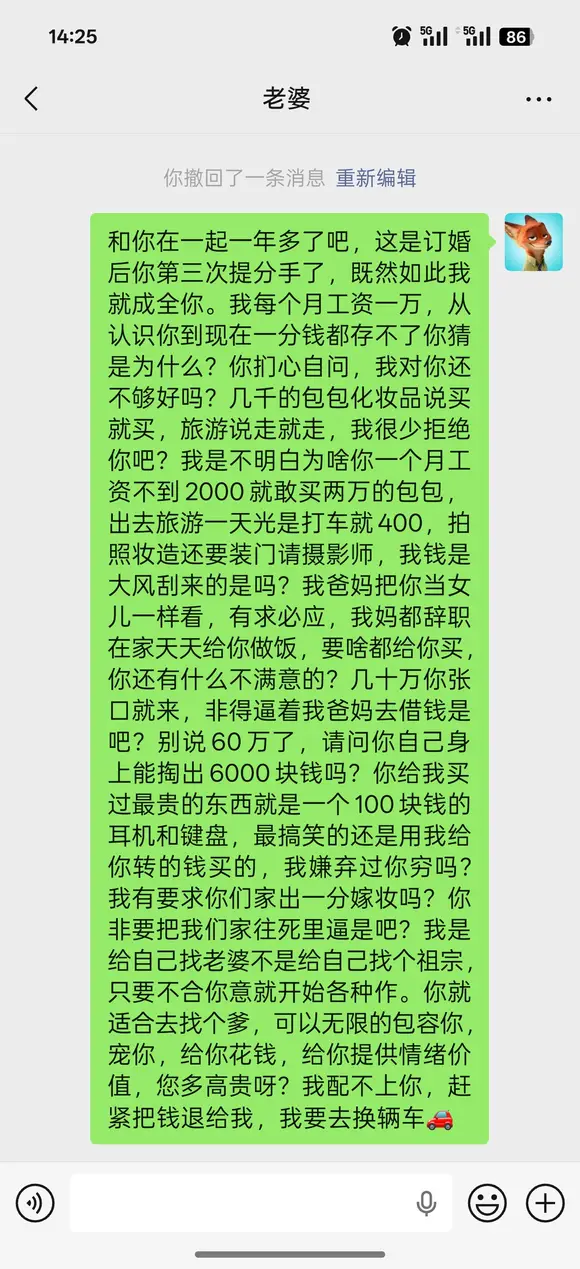訂婚花了十幾萬,完事跟我說訂金是訂金,彩禮是彩禮,房子裝修21萬,婚禮婚紗婚慶十幾萬,現在還要外加20萬彩禮,她們家一分不出。結婚後她不上班,我還要養她