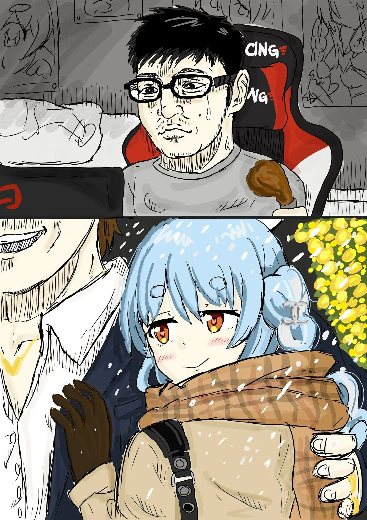 : 一名日本網友「Rakukikun」以 VTuber 兔田佩克拉的「冷炸雞」迷因為主軸創作,指稱