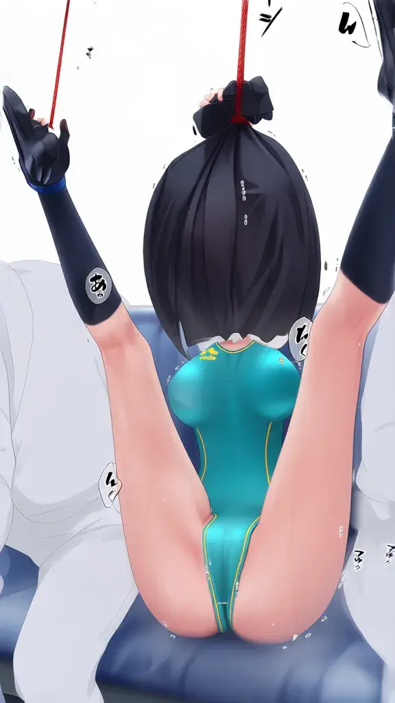 : 技連身泳衣。她的雙腿向兩側大範圍打開,呈現M字型,雙手被紅色的繩索向上懸吊拉起