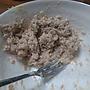 兩塊蔥油餅. 兩片薯餅. 兩顆蛋. 一個鮪魚罐頭. 1/5條美乃滋. 1/8顆洋蔥. 姆咪. 鮪魚泥加一點點洋蔥碎好好吃捏.