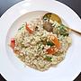 綠咖哩嫩雞燉飯. 顏色看起來淺淺的 可是味道超豐富. 什麼香茅 青檸 羅勒 跟一些不熟的的味道混合在一起. 也不會說很衝突 滿和諧的. 那個紅蘿蔔也完全沒有蘿蔔臭 讚!. 有夠香. --.