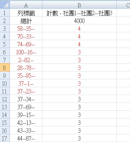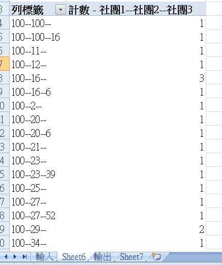 100--16-- 3 ==> 參加社團100跟社團16的,共有3個學生