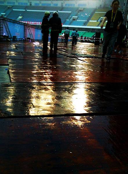 泉州的諾亞方舟有八樓高的巨大屋頂,強風大雨還是將台上的黑色地毯浸濕,空氣