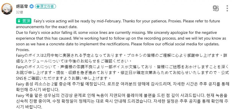 官方補充Fairy日配缺失原因是因為CV生病