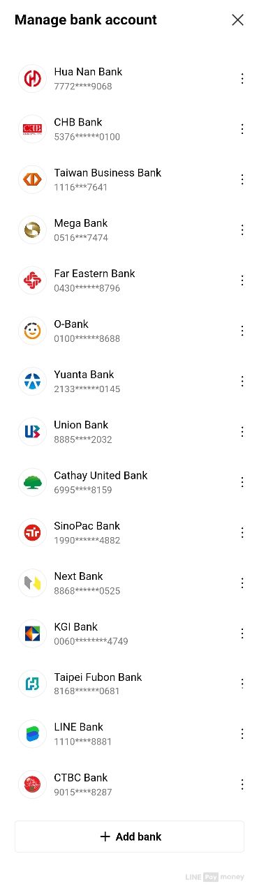 永豐、中信、連線、富邦、將來、兆豐、華南、彰化、台企、郵局