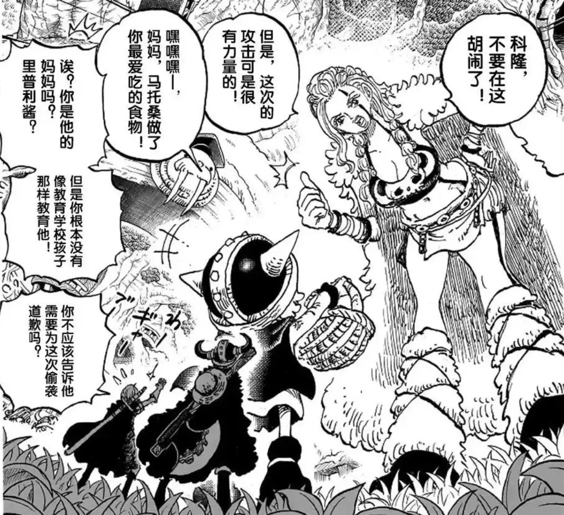 一旁帶著角盔的巨人族孩子與初登場的科隆裝扮相似