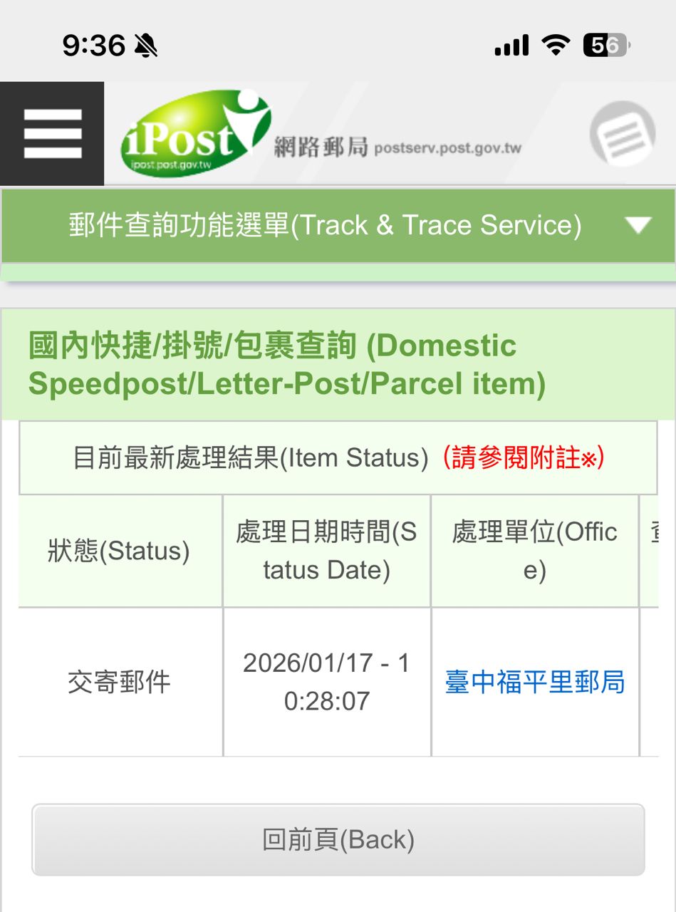 [郵務] 掛號查詢狀態一直是交寄郵件?