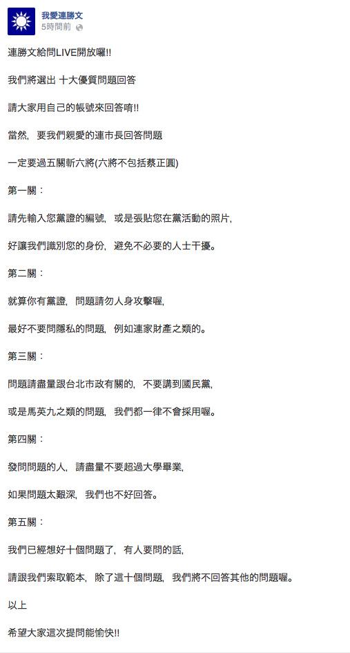 [討論] 今晚連勝文臉書線上的對答活動