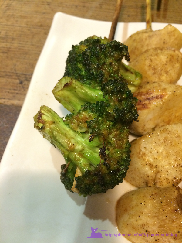約十五分鐘左右我們點得串烤就來了,這盤由左至右分別是花椰菜($35),