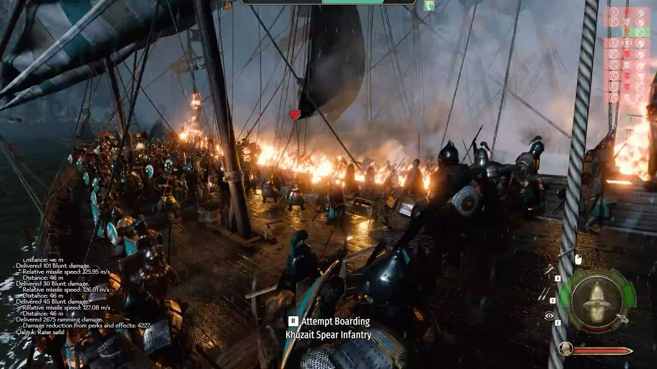 至於海戰戰鬥本身,玩家可以率領艦隊,與敵方海軍在海上激戰。弩炮、火箭、撞角、登