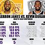 例行賽:雙方共計交手21次,詹姆斯15勝6敗領先。. 例行賽數據:. 詹姆斯:場均28.0分7.0籃板7.0助攻,三項命中率分別為51%/36%/73%,真實命中率為59.7%。. 杜蘭特:場均29.0分7