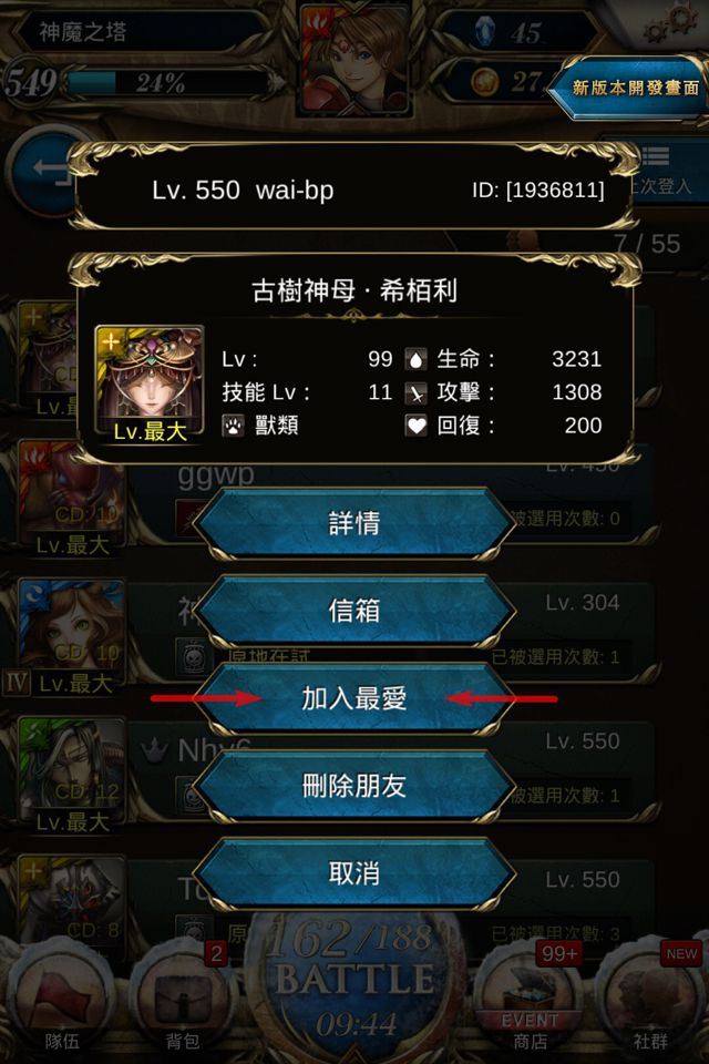 召喚師加入了友人的賬號或遇上愛用的戰友,將能把這些友人「加到最愛」,讓管理