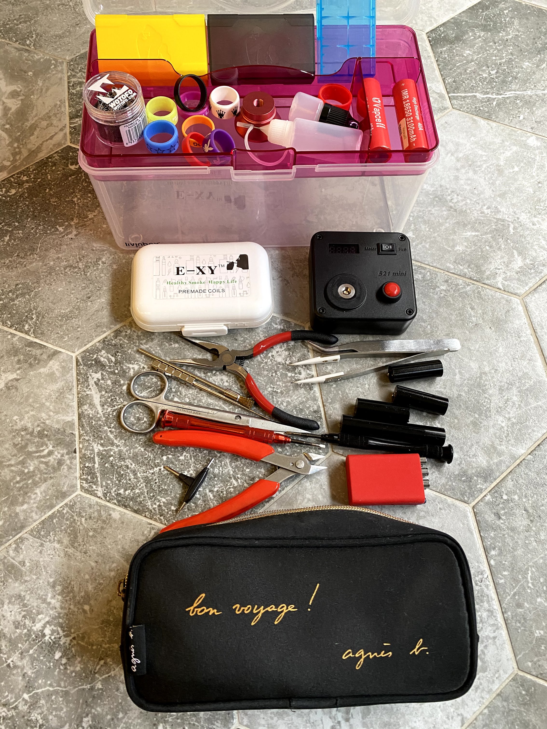11. 一般工具組, vapcell兩顆, 鈦棉, 剩一些coil munsta Ni80 28AWG,電池盒...等等,